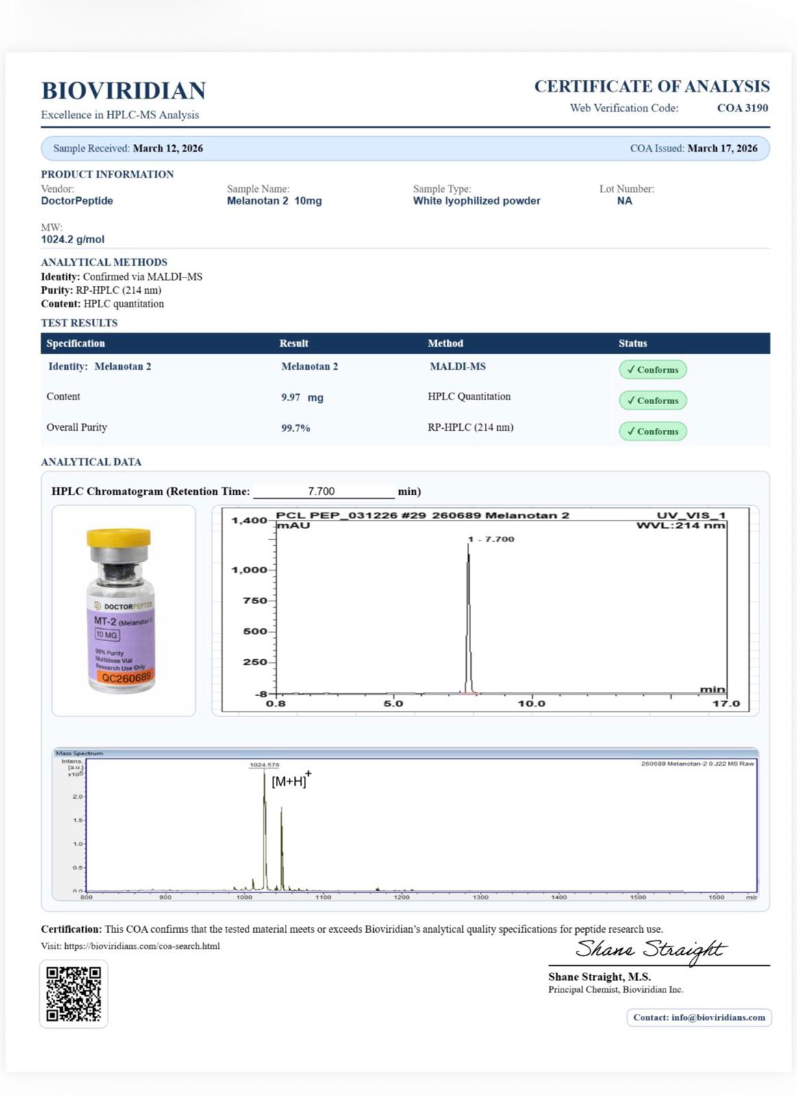Melanotan II (MT‑2) is a synthetic peptide that has been investigated in preclinical and experimental research for its alleged roles in melanocortin receptor signaling, pigmentation, appetite regulation, and neuroendocrine pathways. Scientific studies have explored its potential influence on melanin production and related biological processes; however, these effects remain investigational and are not clinically established. MT‑2 is not an approved drug or dietary supplement and is supplied for research use only. Not for human or veterinary consumption.